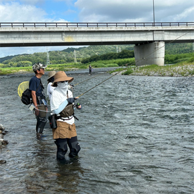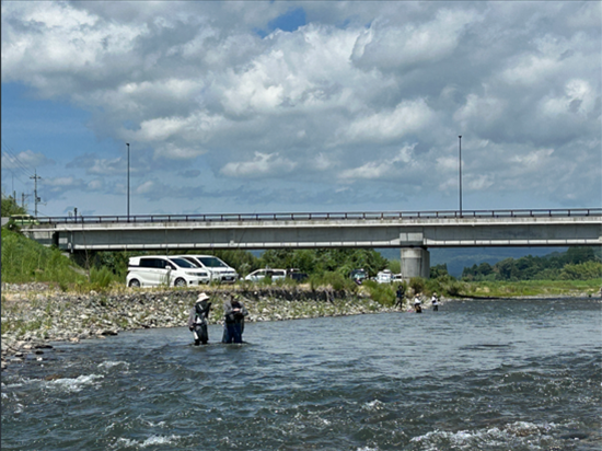 釣り体験会当日、やや増水気味の高めの水位ではありましたが、日が高くなるにつれて鮎の活性も上がり徐々に釣況は良くなりました。