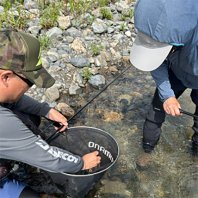 友釣りの経験はある方、渓流釣りは経験あり、ルアー釣りの経験はあります、といった方の参加ではありましたが、本格的な鮎ルアーの釣り方は未経験。そこでスタッフがまず、基本的な狙い方をデモンストレーション、そしてレクチャーしながらほぼマンツーマンで釣り方をレクチャーしました。