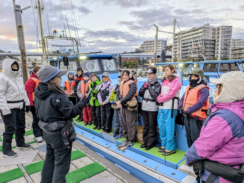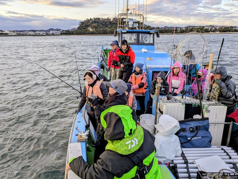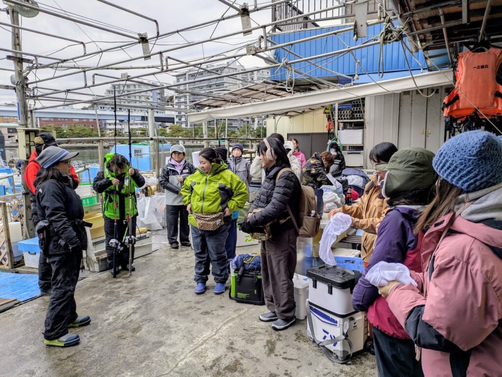 電車でのアクセスがよく、公共交通機関を利用してご参加いただいた方も半数近くいました。 受け付けのあと、全員が揃ったところで乗船時の注意事項などをアナウンス。ほぼ全員がレンタルタックルということで、つりジェンヌオブザーバーの入稲福佳寿巳さんが講師として同行。八景島シーパラダイスが目の前に見える湾内でミヨシ側に集まり、仕掛けの投入から誘い、取り込みといった基本の釣り方をレクチャー。追い風が少し強めに吹く中、みなさん前後のキャビンに入って、千葉・富浦沖へ向かいます。