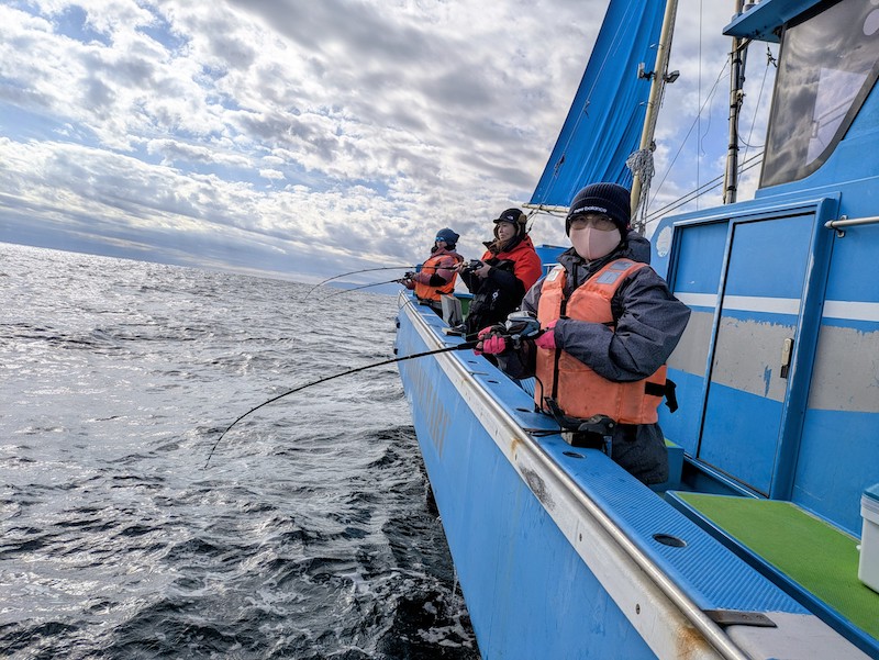 水深150mで再開すると、ひと流し目からダブルで取り込む参加者もいて、みなさん投入から取り込みまで、スムーズに行えるようになりました。正午を迎えるころ、いい反応に当たり、船中5,6人が一斉に巻いて取り込むシーンも。残念ながら、型見ずの人もいましたが、14時の沖上がりまで懸命に誘い続けていたのが印象的でした。