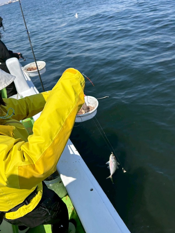 水深は17~20M前後、潮は速くなく、隣とオマツリもほぼ無く初心者様には釣り易い状況。朝一のアジの食いはそこまで良くはありませんでしたが、暫くコマセを巻くと船中でぽつぽつとアジを釣り上げる方が出てきます。
